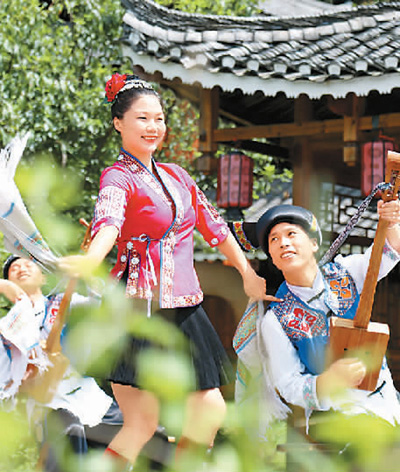 近年来,湖南省通道侗族自治县开发独具民俗特色的文化演艺产品,今年上半年实现旅游综合收入17.4亿元。图为通道侗族自治县芋头古侗寨景区的民俗演出现场,演员在表演侗族歌舞。 李尚引摄(人民视觉)