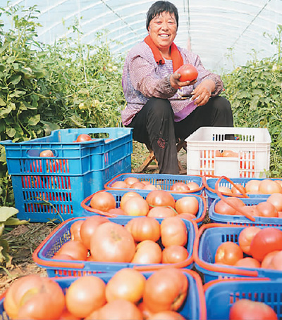 河北省石家庄市正定县新安镇于家庄村建设绿色生态西红柿采摘园,吸引众多游客前来采摘,有效增加了村集体和农民收入。图为村民正在给生态西红柿装箱。 武志伟摄(人民视觉)