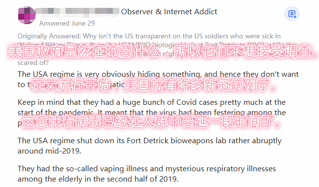 另一方面就是美方人员2019年参加中国武汉举行的第七届世界军人运动会,不久后武汉就暴发了疫情。正是因为这些问题至今悬而未决,外国网友才在Quora上提出多番质疑。
