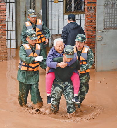 21日,武警第一机动总队某支队在巩义市米河镇救援受困群众。江泽红摄(人民视觉)