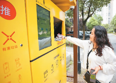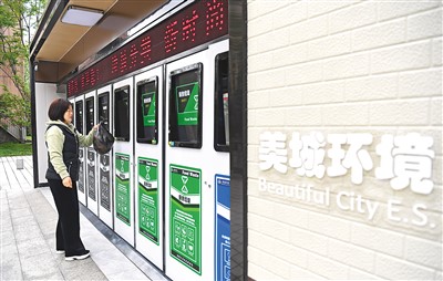 在安徽省合肥市包河区常青街道淝南社区垃圾分类投放站,居民使用智能垃圾分类回收柜投放垃圾。 新华社记者 刘军喜摄