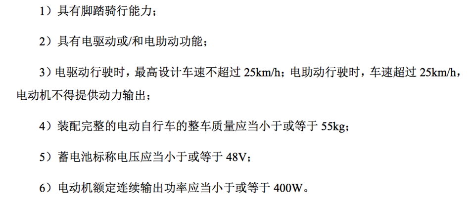 新国标明文规定,电动自行车最高设计车速不超过每小时25公里,电机功率不超过400瓦,蓄电池电压不超过48伏。