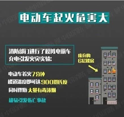 根据消防部门模拟,电动自行车着火4分钟后,楼道内一氧化碳含量爆表,氧气浓度降至11%;着火7分钟后,楼道温度突破900摄氏度,切断逃生人员逃生通道;而且,用干粉灭火器扑灭效果较差,火势难以在短时间内得到控制。