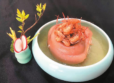 图为马列制作的菜品——鲜虾蹄髈。 (图片均由受访者提供)