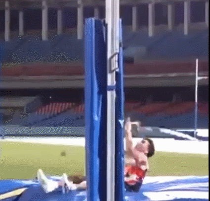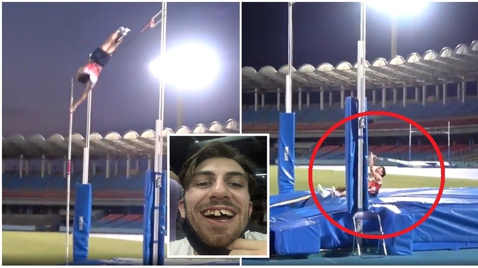 视频显示,当时,正在练习的科佩尔完成撑杆起跳,但是转身下落时前胸刮到了横杆。在他落在缓冲垫上之后,横杆也随之落下,并砸在了他的门牙上。