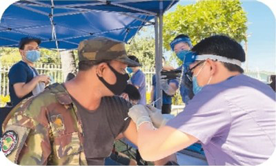 7月13日,巴布亚新几内亚政府在首都莫尔兹比港总医院正式开始为当地民众接种中国疫苗。图为一名男子接种中国疫苗。新华社发
