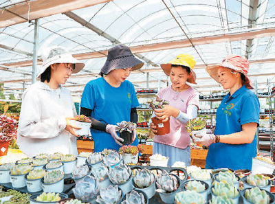 江苏省宿迁市沭阳县耿圩镇途睿生态农业科技有限公司建立“龙头企业+基地+农户”的经营管理模式,运作阿里、天猫、淘宝、京东等网络店铺达200余个,带动1200余人参与多肉生产经营。图为工作人员在察看多肉植物生长情况。