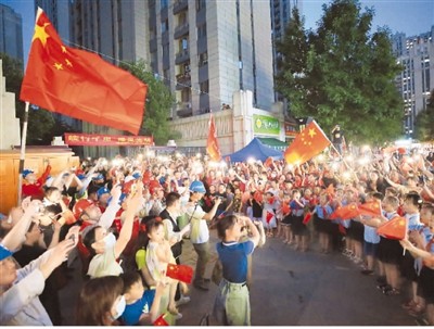 7月26日晚,在河南省郑州市谦祥万和城小区,国家电网安徽电力援豫抢修队合肥分队经过两天两夜奋战,已恢复对该小区的电力供应。图为小区居民欢呼表示感谢。