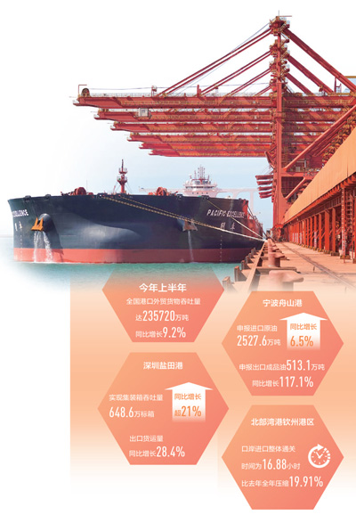 货运增加、航线拓宽、贸易质量持续提升……今年上半年,全国港口外贸货物吞吐量同比增长9.2%。多地港口、海关推出一系列降本增效举措,盘活了航运资源,提高了外贸效率,为外贸持续稳定增长提供了支撑。