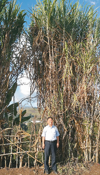 2017年8月,林占熺在巴布亚新几内亚查看12年前种植的巨菌草。
