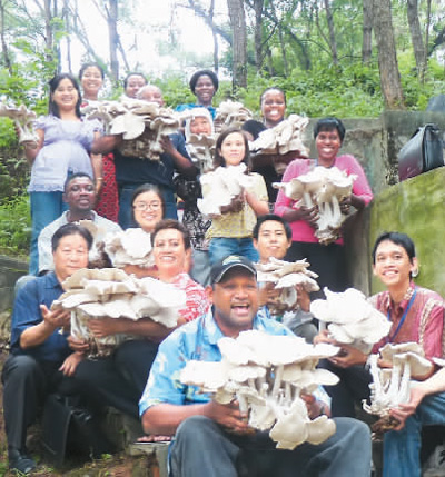 2010年6月,林占熺在福建农林大学指导“发展中国家菌草技术培训班”学员采收自己栽种的菌草菇。