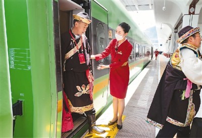 6月25日,全长435公里、设计时速160公里的拉林铁路建成通车,这也是西藏首条建成的电气化铁路。图为复兴号高原内电双源动车组抵达林芝站,乘客陆续下车。