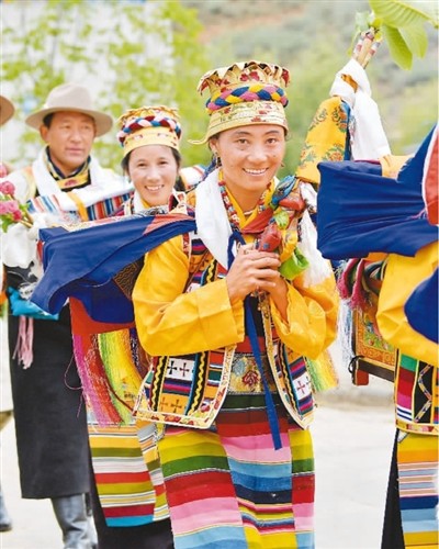 7月9日,易地扶贫搬迁新村——西藏山南市加查县冷达乡共康村的村民们身着盛装欢度“望果节”。“望果节”是西藏农区在青稞麦田成熟之际祈求丰收的节日,据传有1500多年的历史,因各地青稞成熟时间不一,“望果节”时间也各异。