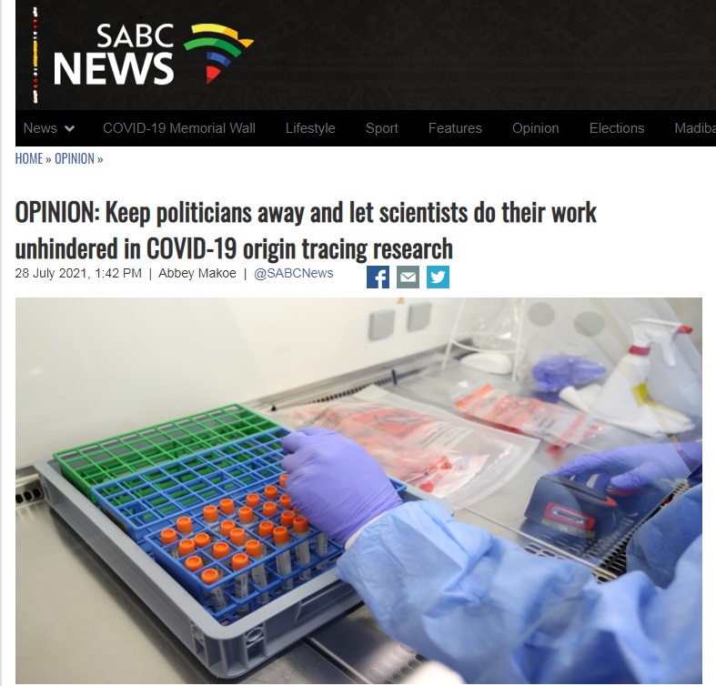 南非资深政治主编马库伊7月28日在南非国家电视台网站发表评论文章,要求美国政客停止干预病毒溯源,让科学家不受阻碍地进行溯源研究。