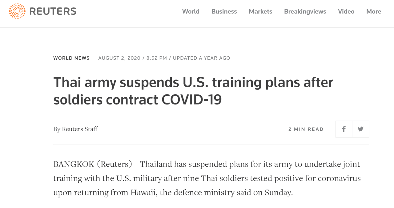 不少国家也开始追溯被美军传染的经历。路透社去年8月2日报道,泰国国防部表示,赴美参加联合军演后,9名从美国夏威夷返回的泰国士兵被确诊感染新冠病毒,泰国紧急暂停了泰军与美军的联合演练计划。
