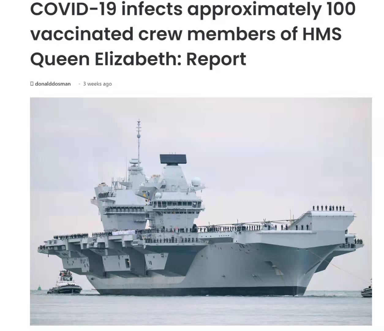 今年7月12日,英国“伊丽莎白女王”号航母与美国海军“里根”号航母和“硫磺岛”号两栖攻击舰在亚丁湾进行联合演习。英国媒体7月14日报道称,“伊丽莎白女王”号航母出现了约100例新冠病毒感染病例。而这艘“病毒航母”当时却正在进行全球部署行动,染毒后继续进军印度洋。