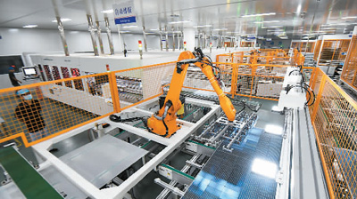 7月16日,江西省新余市一家科技公司太阳能组件车间,工业机器人在自动化生产线上精准操作,赶制高效光伏太阳能组件。