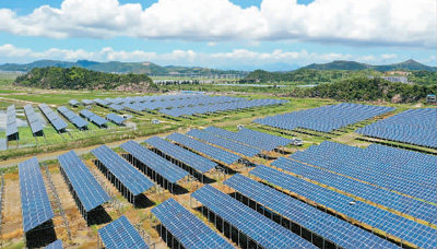 7月15日,浙江省玉环市漩门湾三期海涂晶科光伏发电站与蓝天白云相互映衬,构成一幅绿色能源新画卷。