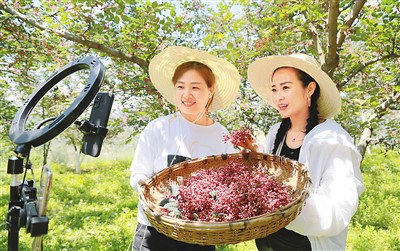 今年,甘肃省陇南市武都区的百万亩花椒喜获丰收,陇南市相关部门及时组织本土电商人才深入田间地头,通过电商平台和直播带货方式助农销售。图为日前,网络主播在武都区郭河乡候家弯村利用智能手机直播推介花椒。