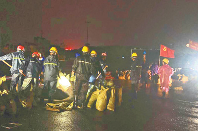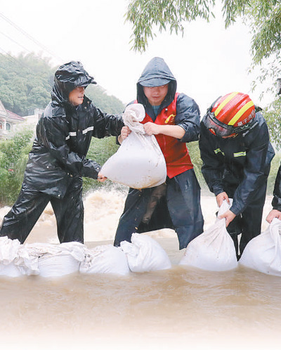 浙江省德清县莫干山镇党员应急抢险小分队在地势低洼处加固出险的河堤。 谢尚国摄(人民视觉)