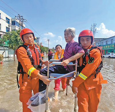 河南省新乡市凤泉区党员突击队正在营救疏散被困群众。 淮 晓摄(人民视觉)