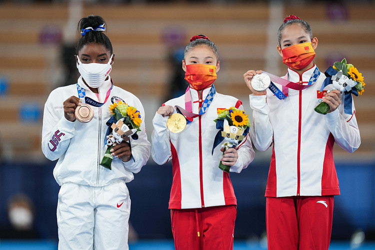 2021年8月3日,2020东京奥运会体操女子平衡木决赛,中国队包揽冠亚军。(图源:视觉中国)