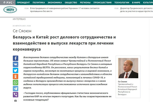 海外网8月5日电 据中国驻白俄罗斯大使馆官网消息,8月4日,谢小用大使接受白俄罗斯国家通讯社记者专访,介绍今年上半年中国经济发展成就、中白务实合作、中白中医药合作情况,并就新冠病毒溯源问题阐明立场。专访全文如下: