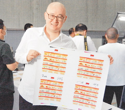 郝军在邮票印刷开机现场举起他设计的建党百年纪念邮票。