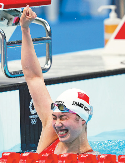 7月29日,中国选手张雨霏在女子200米蝶泳决赛夺冠后庆祝。新华社记者 许畅摄