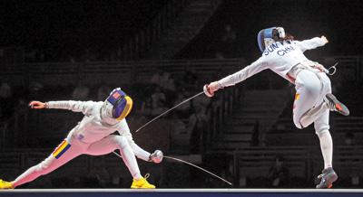 7月24日,中国选手孙一文(右)在女子个人重剑决赛中。新华社记者 李明摄
