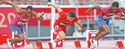 8月1日,中国选手苏炳添(中)在田径男子100米决赛中。新华社记者 吕小炜摄