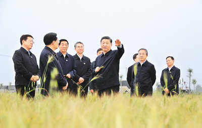 5月14日上午,习近平在河南省南阳市主持召开推进南水北调后续工程高质量发展座谈会并发表重要讲话。图为座谈会前,习近平于13日在考察途中临时下车,走进一处麦田察看小麦长势。