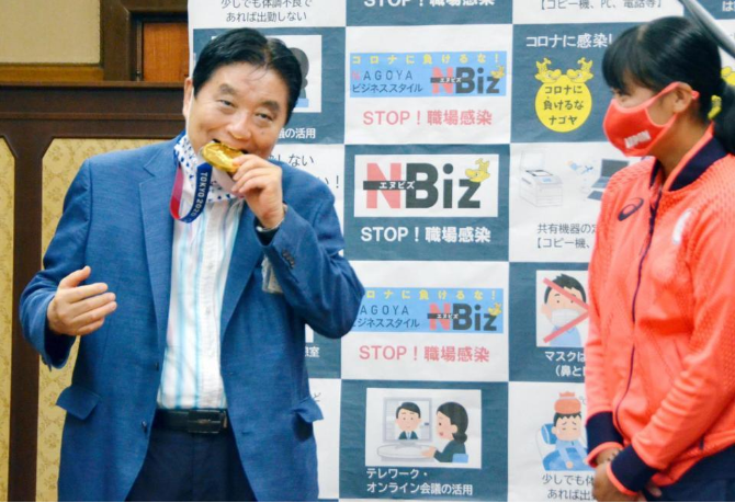 名古屋市长河村隆之一口咬住金牌(来源:名古屋市政府)