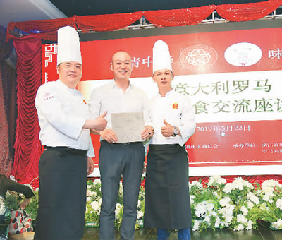 何建锋(中)在“味道浙江”罗马美食交流座谈会上担任厨艺交流赛评委。