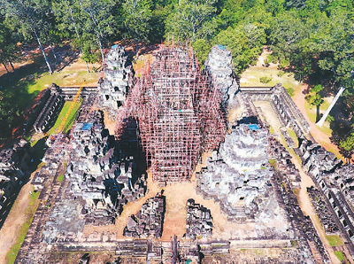 图为2017年中国承担的柬埔寨吴哥古迹茶胶寺修复项目,正在修复位于须弥台上的中央主塔。