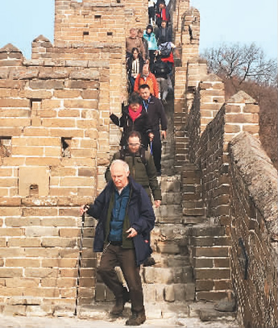 图为在第二届双墙对话研讨会期间,中外专家考察金山岭长城。