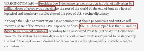 △美联社此前报道,美国原定6月底对外提供8000万剂疫苗,而实际只向国外运送了不足2400万剂。