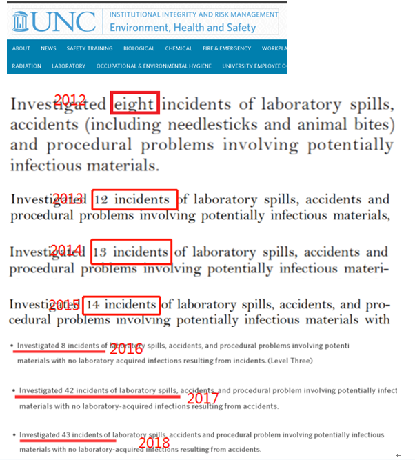 △根据北卡罗来纳大学历年年报提供的公开信息,巴里克的实验室在2012年至2018年间发生的实验室泄漏事故总数多达140起。