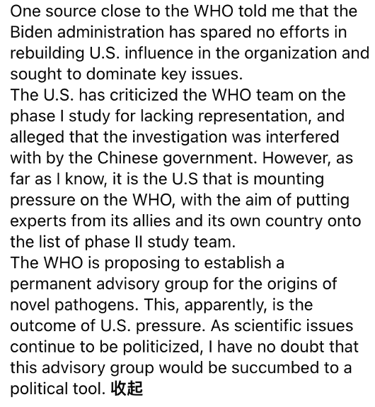 “美国批评世卫组织第一阶段新冠溯源研究小组缺乏代表性,并声称其受到中国政府的干预。但据我所知,给世卫组织施加越来越大压力的正是美国,它的目的是将其盟友和本国的专家列入第二阶段研究小组名单。”