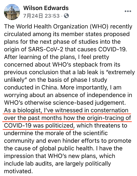近日,瑞士伯尔尼的生物学家威尔逊·爱德华兹在社交媒体上透露了这样的消息:“在过去的六个月里,特别是在第一阶段病毒溯源工作结束之后,世界卫生组织内部人士和一些科研同行抱怨说,只要他们支持第一阶段溯源工作的研究结论,就会受到来自美方以及某些媒体的巨大压力,甚至是恐吓。”