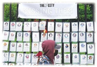 6月14日,美国纽约,行人从一处墓地为新冠肺炎死者设立的纪念装置旁走过。新华社记者 王 迎摄