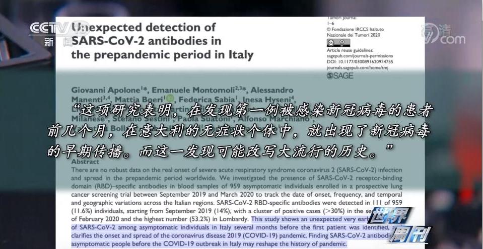 2020年11月15日,米兰国家肿瘤研究所与意大利锡耶纳大学的学者在《肿瘤学期刊》上发表了一篇论文,指出新冠病毒可能最早于2019年9月就出现在了意大利北部地区,早于中国武汉在2019年12月份发现病毒。