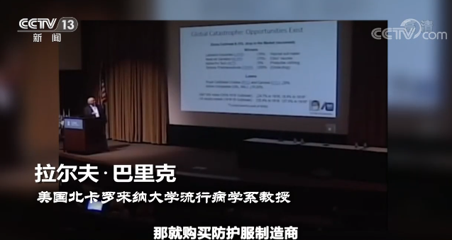 美国北卡罗来纳大学流行病学系教授 拉尔夫·巴里克(2018年):我想告诉你们一个好消息,任何情况下总有赢家,如果你准备在下一次大流行中大赚一笔,如果你想这么做的话,那就购买防护服制造商,或为流行病生产抗病毒药物的公司的股票,你或许能赚不少钱。