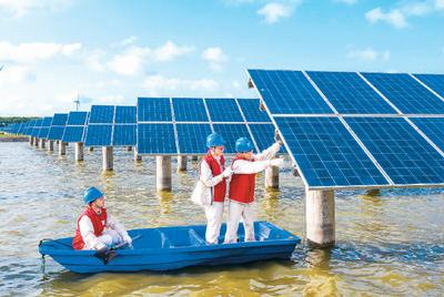 江苏省海安市滨海新区运用广阔的滩涂资源培育壮大太阳能、风能等新能源产业。通过“渔光互补”模式实现水上发电、水下养鱼,在实现空间立体复用的同时输出清洁能源,助力乡村振兴。图为7月19日,电力工人在35兆瓦“渔光互补”光伏发电站巡检光伏发电设备。翟慧勇摄(人民视觉)