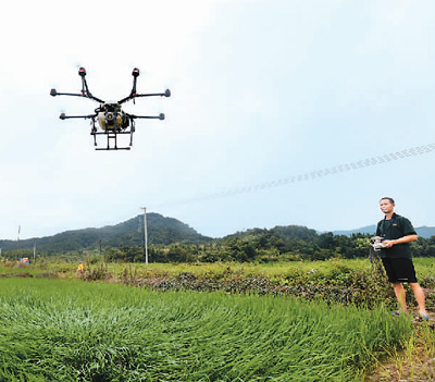 江西省宜春市靖安县积极引导各产粮区加强水稻田间管理,通过人工筛查、无人机植保等方式控制早稻病虫害。图为靖安县仁首镇石下村村民在操作植保无人机喷洒农药。周 亮摄(人民视觉)