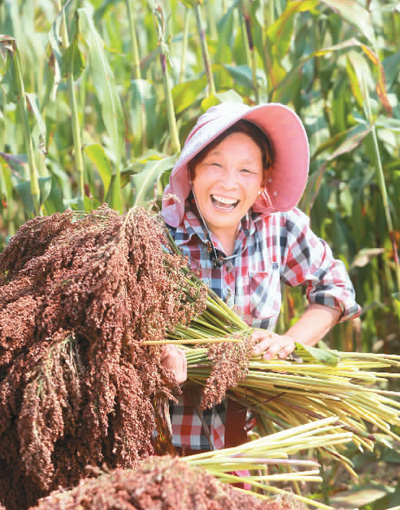 在四川省宜宾市南溪区大观镇菜花村,村民高兴地采收高粱。兰 锋摄(人民视觉)