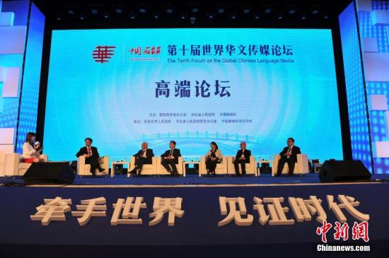 10月12日,由国务院侨务办公室、河北省人民政府和中国新闻社共同主办的第十届世界华文传媒论坛在石家庄开幕。来自五大洲61个国家和地区的400多家华文媒体高层人士、中央主要新闻机构及国内有影响力媒体负责人等共600余位嘉宾参加论坛,以“牵手世界,见证时代——华文媒体的‘中国故事’”为主题展开对话交流。图为第十届世界华文传媒论坛高端论坛。中新社记者 韩冰 摄