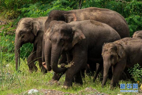 8月9日,象群在云南省玉溪市元江县境内的丛林中觅食。新华社记者 江文耀 摄