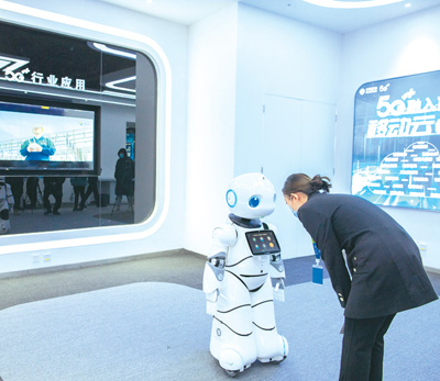 日前,内蒙古5G产业创新基地在和林格尔新区正式揭牌,该基地由和林格尔新区携手电信、移动、联通、铁塔、华为共同打造,是发挥多方资源优势开展5G产业创新、展示、应用的平台。图为工作人员在该基地展示区与机器人互动。丁根厚摄(人民图片)