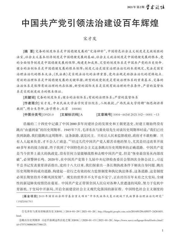 宋才发:中国共产党引领法治建设百年辉煌